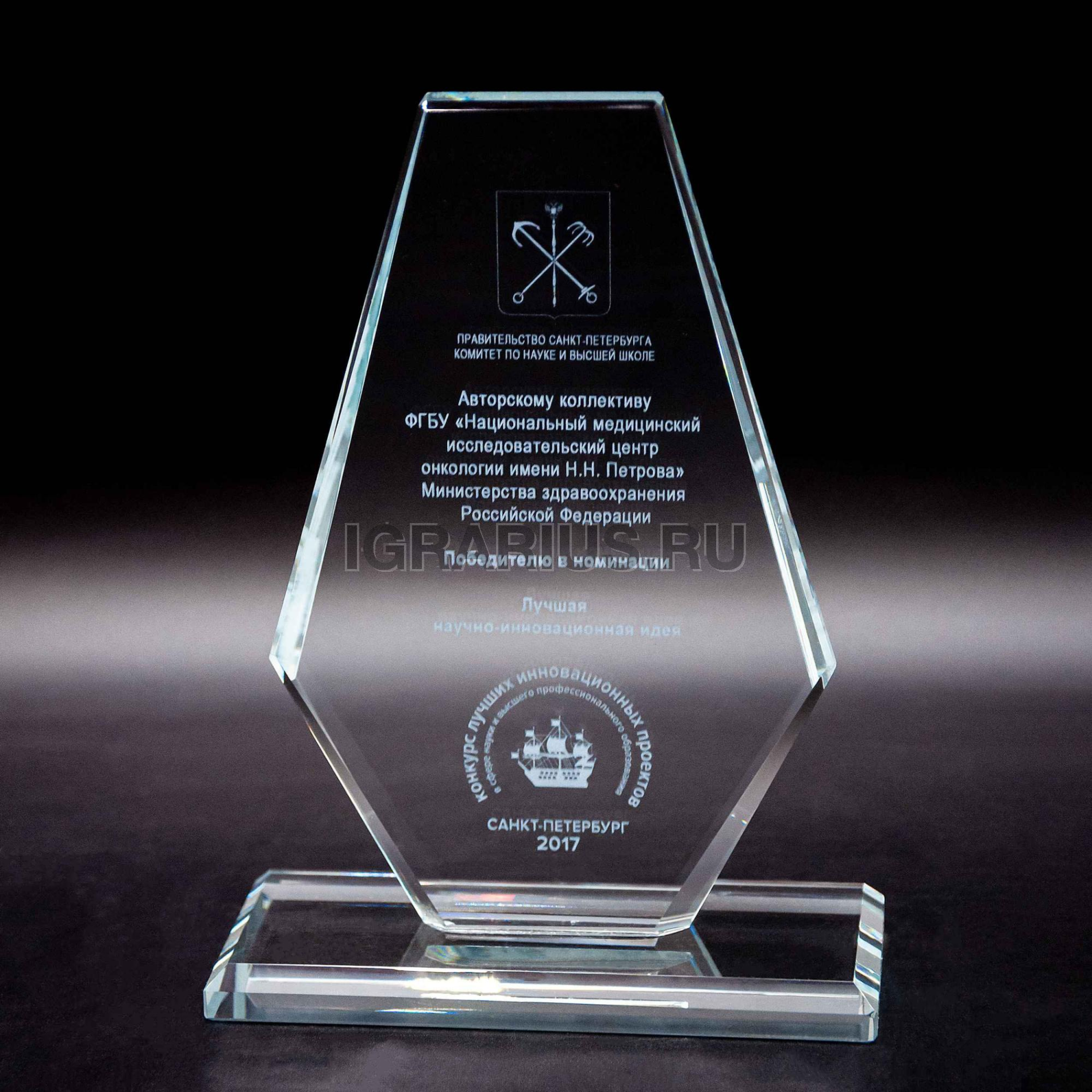 Награда из стекла. Материал - отбеленное стекло "оптивайт" толщиной 10 мм. Возможно изменение размера или формы. По желанию клиента можно изготовить стеклянную награду толщиной 6, 8, 10, 12 мм, либо из зеленого стекла.  Также можно приобрести заготовки наград без нанесения.