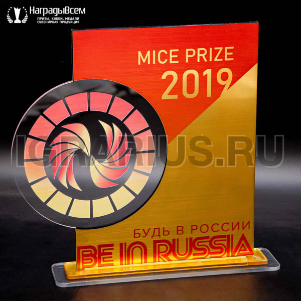 Награда из одного слоя цветного акрила и двух слоев цветного пластика (золото/серебро/бронза) станет:
